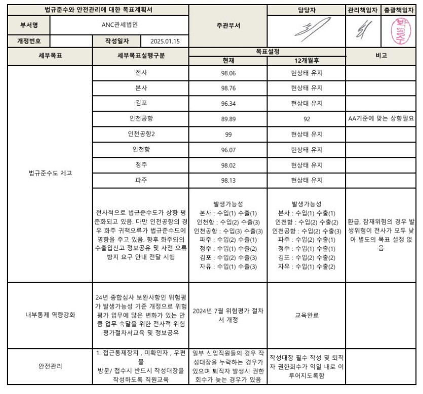 에이엔씨관세법인 법규준수 및 안전관리 경영방침 및 세부목표계획서