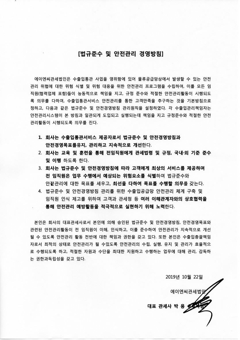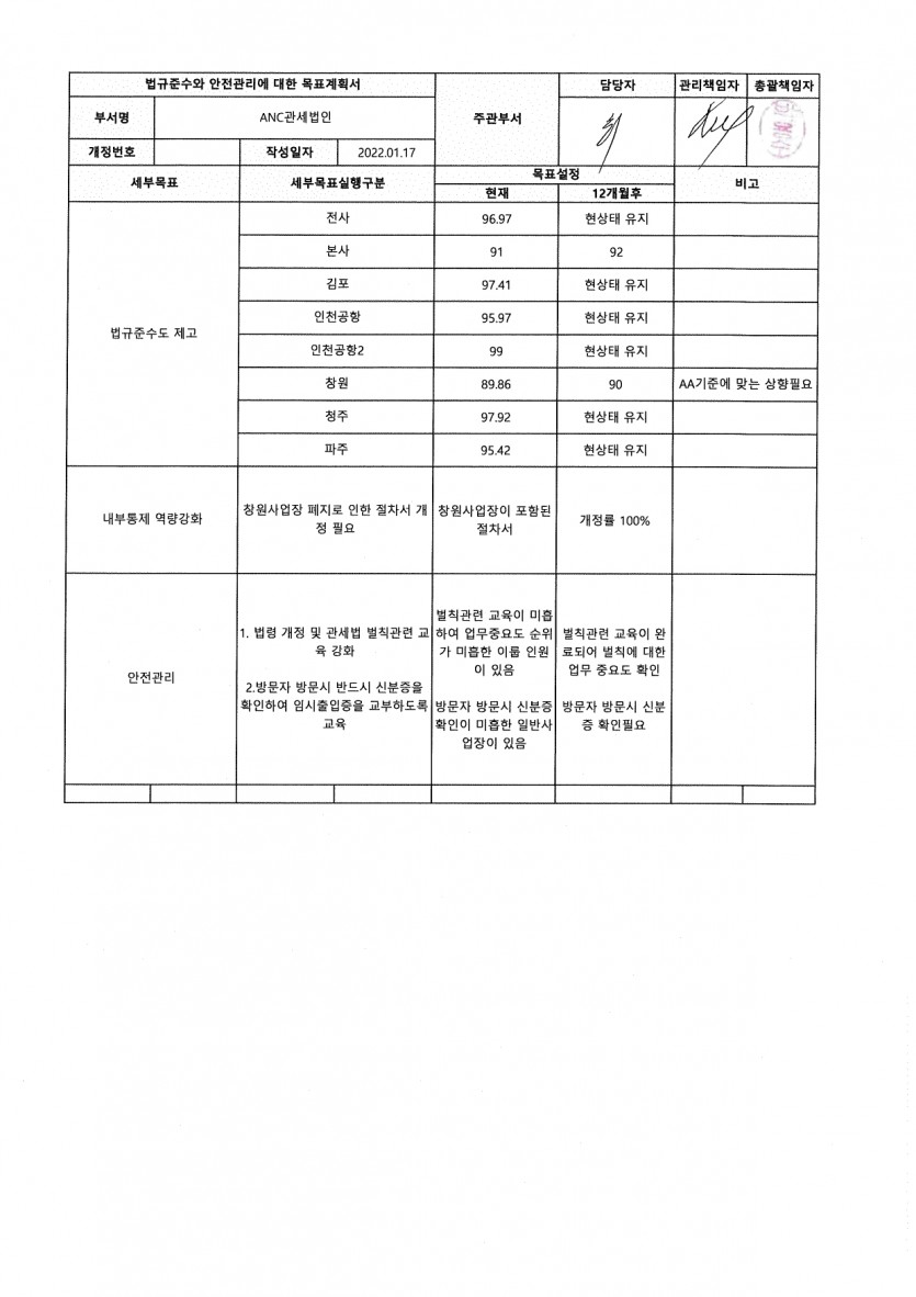 ANC관세법인 법규준수 및 안전관리 경영방침 및 세부 목표계획서
